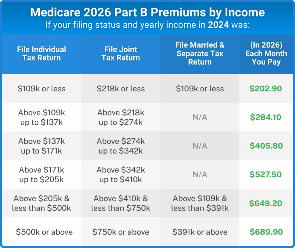 You should know that higher income households pay more for Medicare Part B and Part D plans. The technical term for this surcharge is an “Income Related Medicare Adjustment Amount” or IRMAA. The higher your household income, the more you pay. IRMAA is automatically applied based on your income tax return from 2 years prior. In other words, for 2026, they assess IRMAA based on your 2024 income.